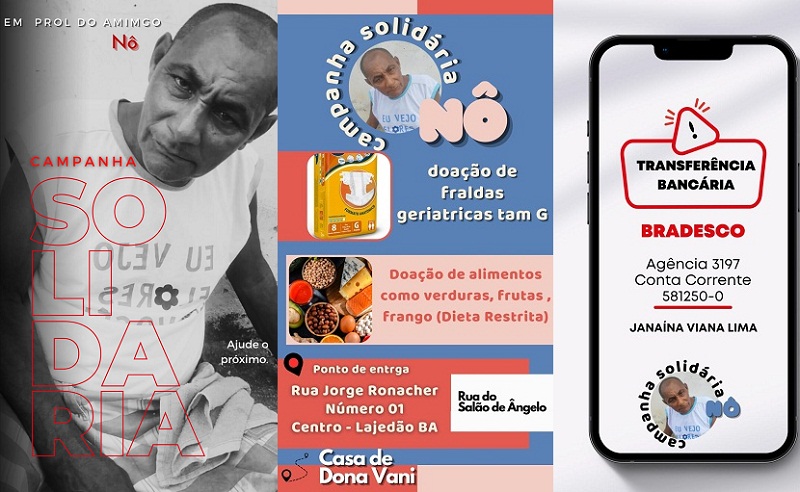 As doações podem ser entregues diretamente na residência da irmã de NÔ, Vani, no seguinte endereço: Rua Jorge Ronache, nº 01, Bairro Fraga, Lajedão, BA.